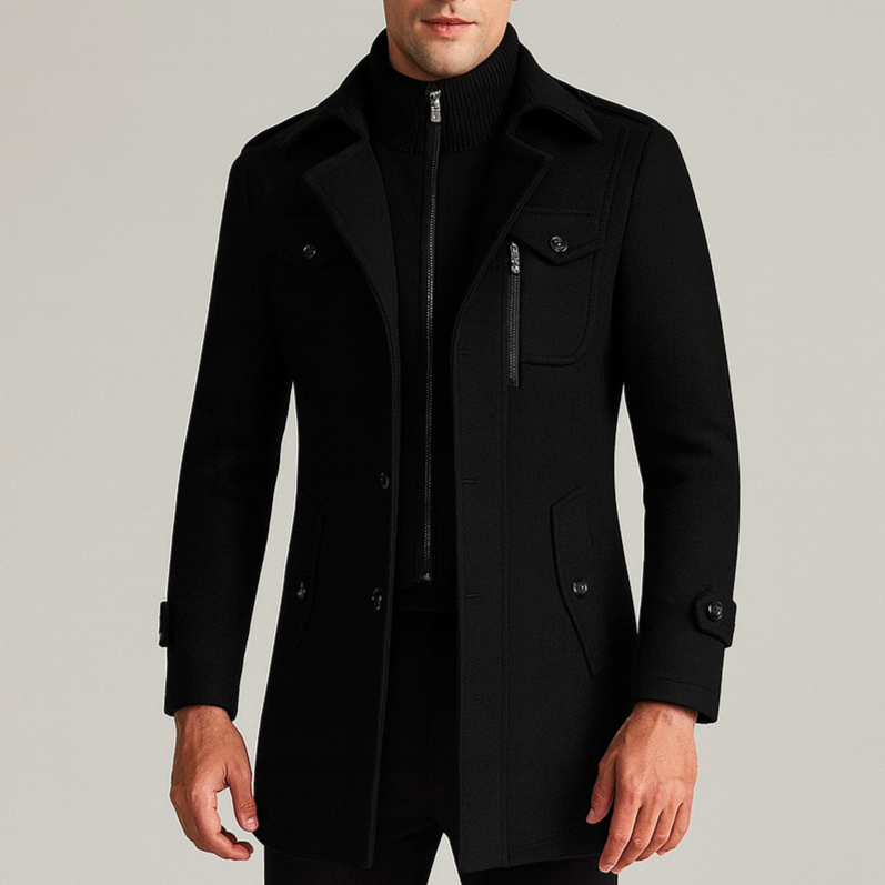 This wool-blend coat brings timeless style with its structured tailoring and fit. Featuring a high ribbed collar, button and zipper closure, and multiple pockets, it’s designed to provide both warmth and refined elegance for cooler seasons.