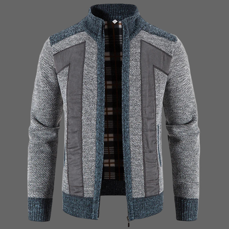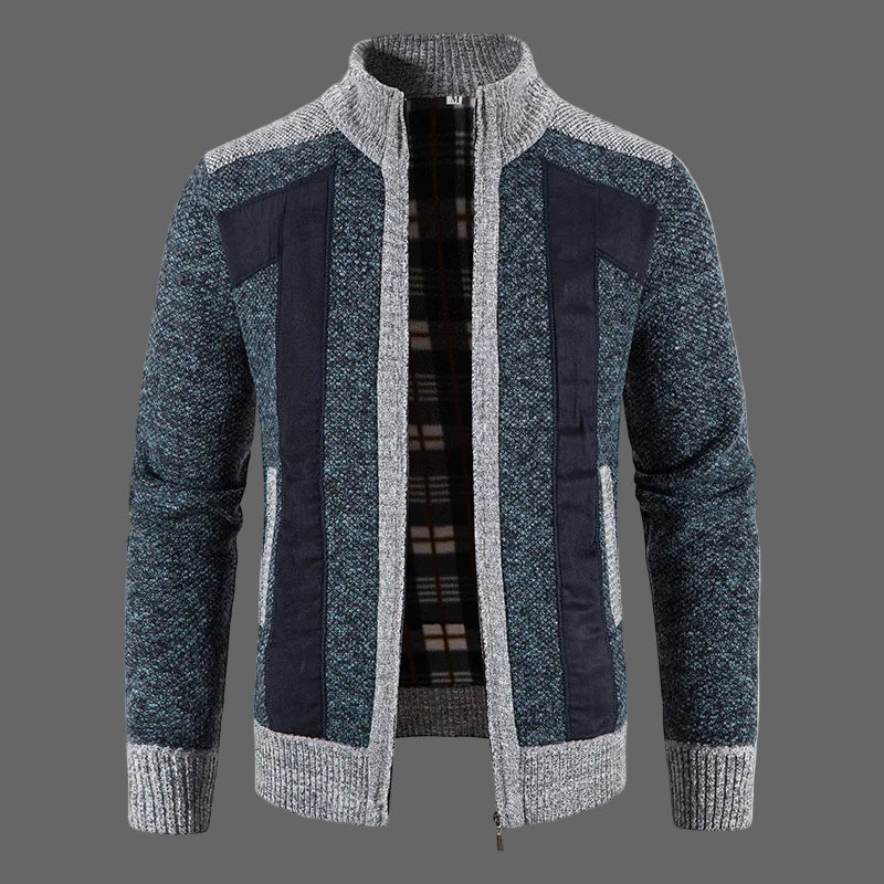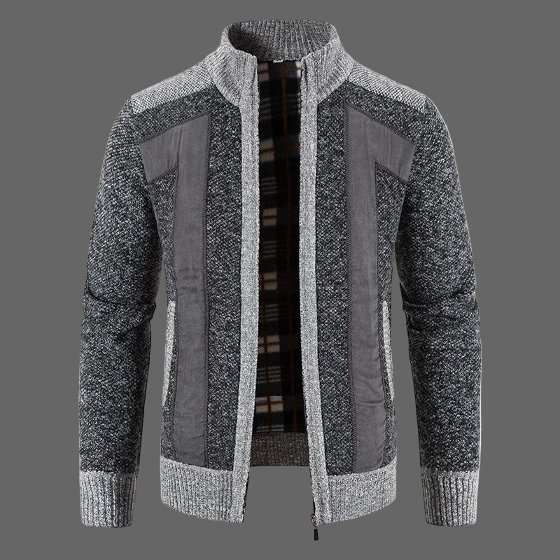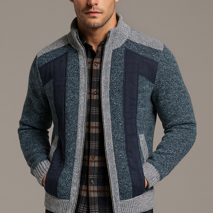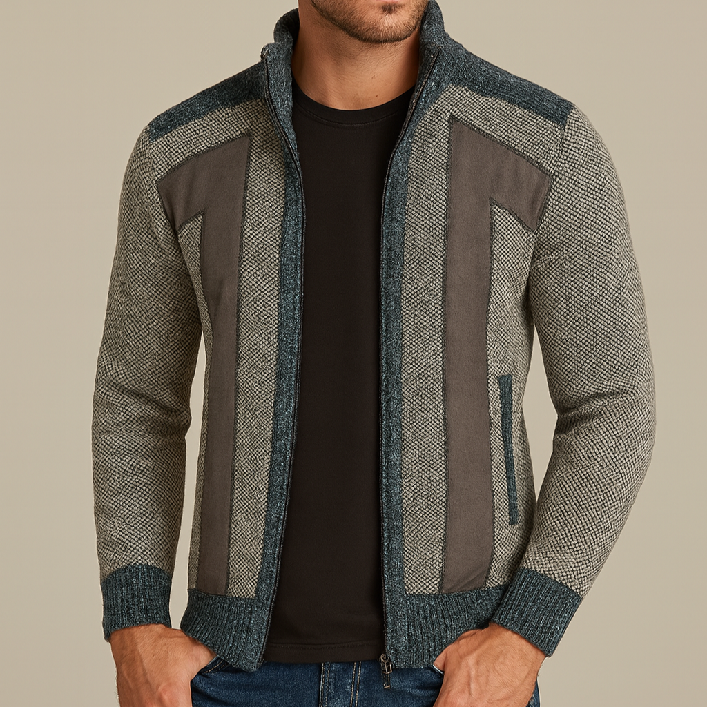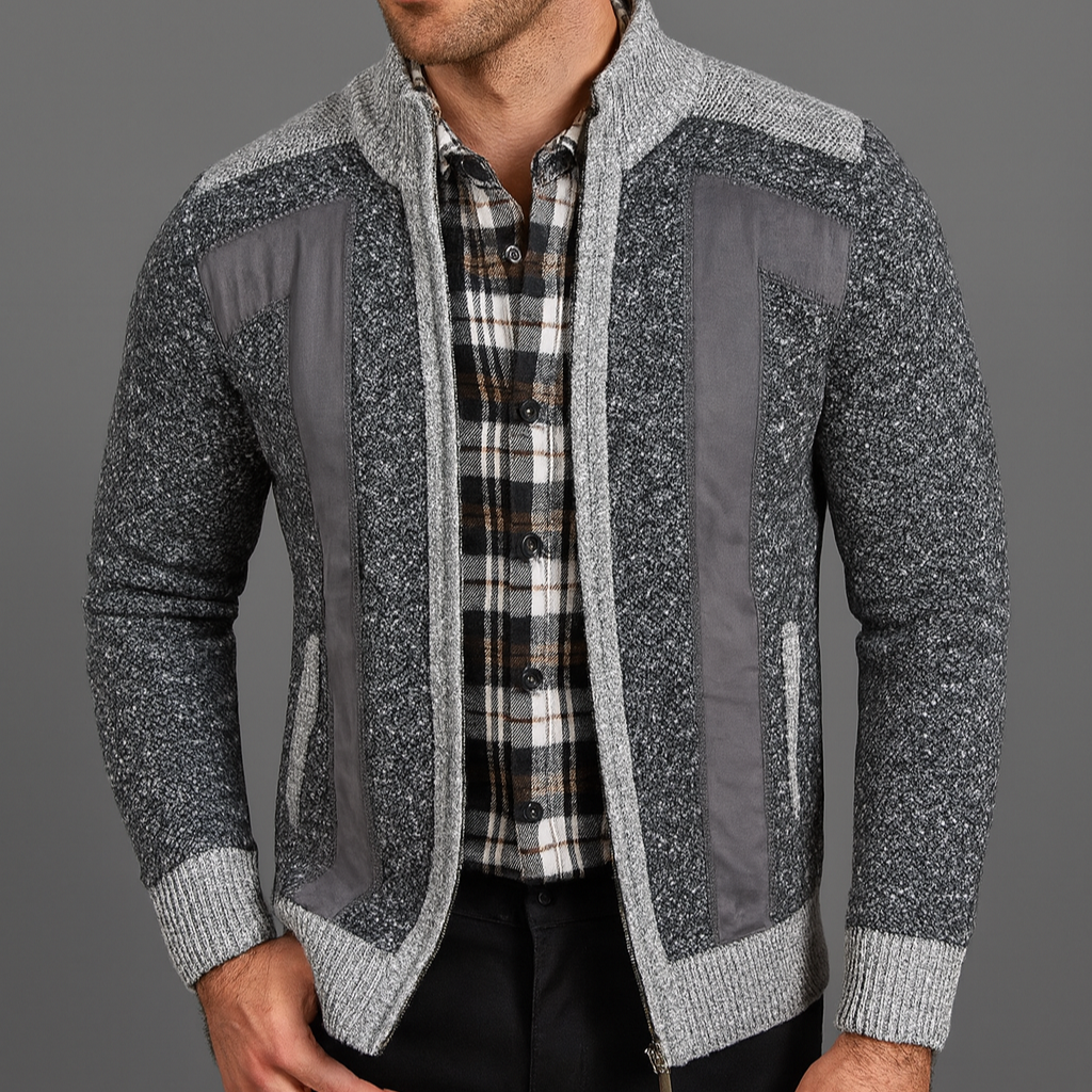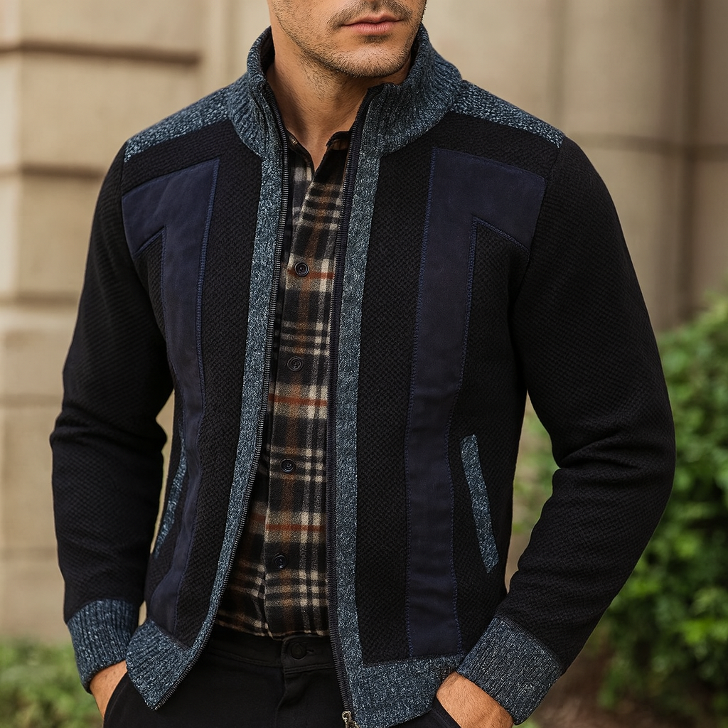 A modern twist on classic knitwear, this zip-up cardigan combines textured knit panels with sleek contrast detailing for a refined casual layer.